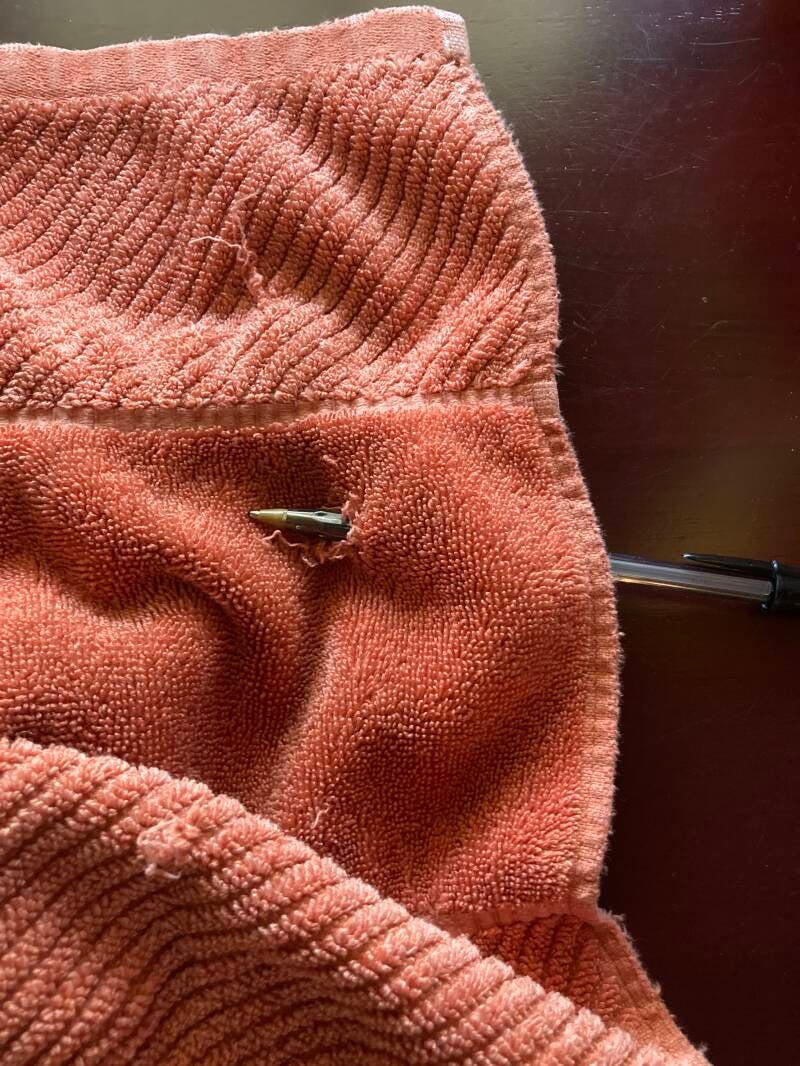 This really old towel had sentimental value aside from me liking the brand, design, and color. However, I had to admit it was faded and worn. Notice the pen showing a hole plus frayed areas and a few loose threads that I could have trimmed, although they might have unraveled more. I couldn't help but notice the negative symbolism of "coming apart at the seams." I imagine this did not bode well for my mental health, as well as taking up space that a nice new towel could occupy. I lovingly let this go.